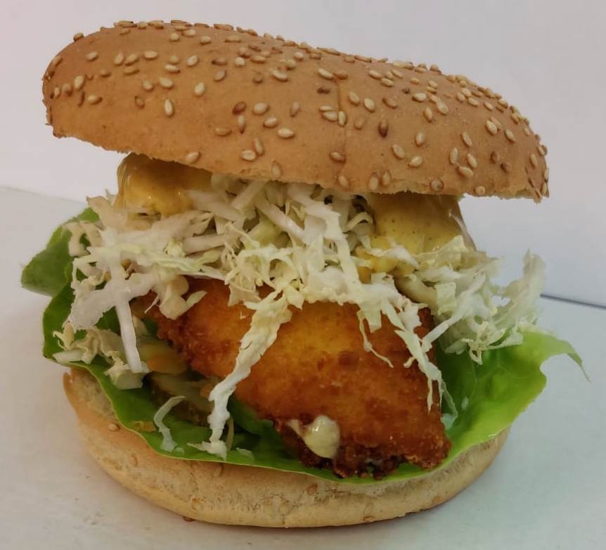 Bułka hamburgerowa 155, 2x kotlet 160mm, 2x plaster żółtego sera, na każdym kotlecie porcja sałatek /liść sałaty, ogórki konserwowe, plasterki ogórka świeżego, plasterek pomidora, porcja sałatki obiadowej, kapusta pekińska/, sos hamburgerowy curry, cebulka prażona opakowanie